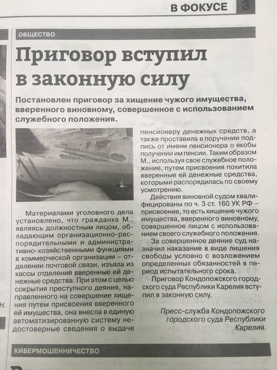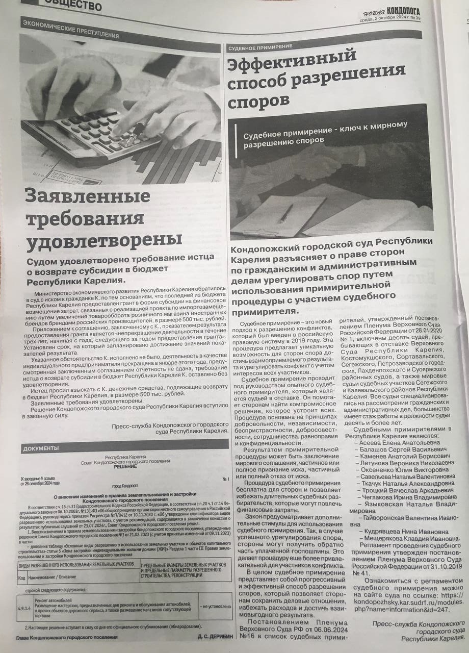 В выпуске газеты «Новая Кондопога» от 02.10.2024 №39 размещена статья о судебном примирении, а также опубликованы материалы о рассмотренных Кондопожским городским судом Республики Карелия делах.