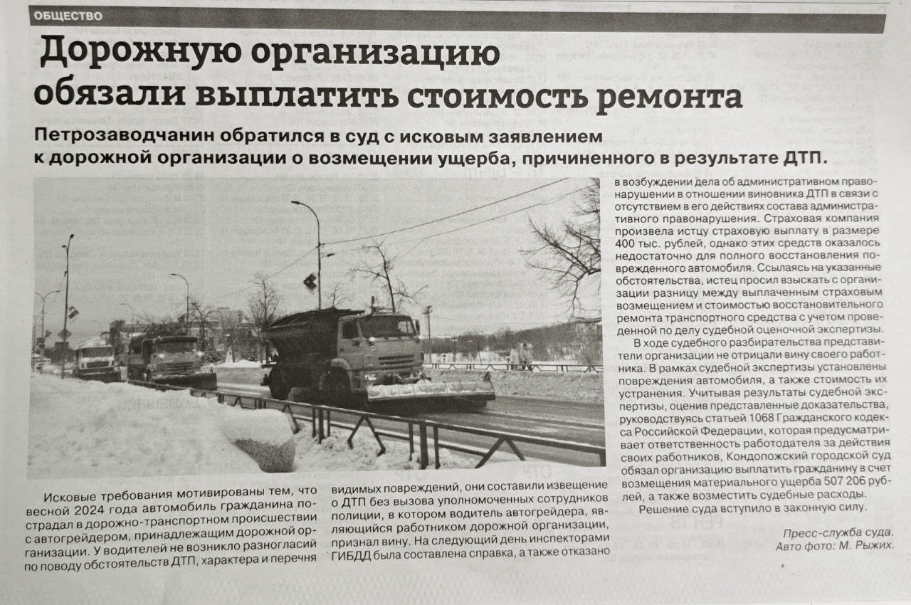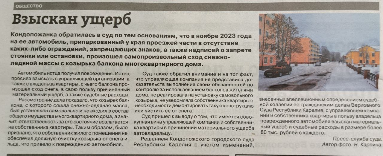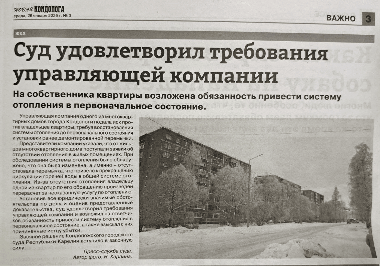 В выпуске газеты «Новая Кондопога» от 29.01.2025 №3 размещены подготовленные пресс-службой суда материалы  о рассмотренных делах.